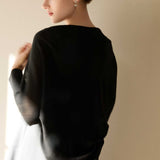 ゆったりとリラックスした身頃に袖口のリブはあえて長めにし、手首まわりがより細く見えるように設計しています。
