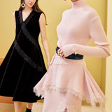 ニットの切り替え部分と裾にはレーストリムがあしらわれています。
