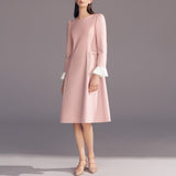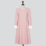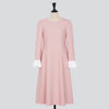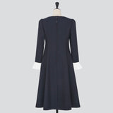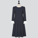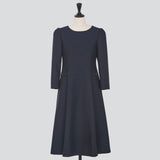 シンプルで上品なAラインシルエットに、共布くるみボタンをあしらった飾りの箱ポケットが程よい華やかさを添えます。