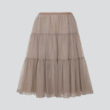 細やかなギャザーを入れたティアードスカートは、フェミニンになりすぎないクールなカラーでスタイリッシュに。