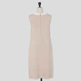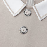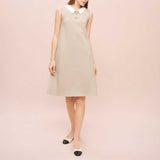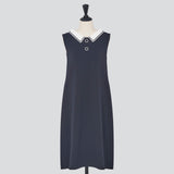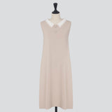 白襟とジュエルボタンが目を惹く、清潔感と上質さが際立つニットワンピース。