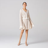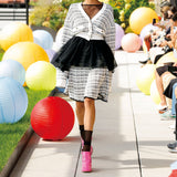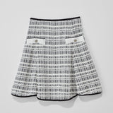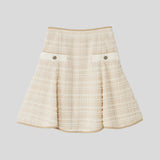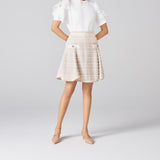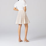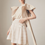 裾に向かって美しく広がるフレアシルエットとミニ丈で、フレッシュかつエレガントな印象に。