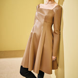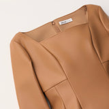 スクエアネックの襟ぐりとフィットした胸まわりのシルエットで上半身を細く見せます。