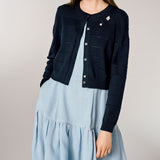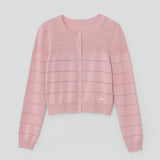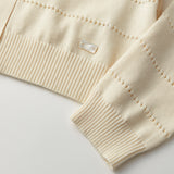 鹿子柄とアイレット柄の異なる編み地で仕立てたカーディガン。