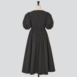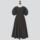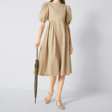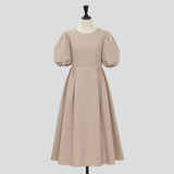 ややフィットアンドフレアシルエットですが、後ろウエストがゴムになっているのでリラックスしてお召しいただけます。
