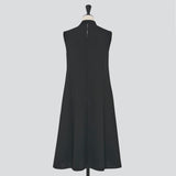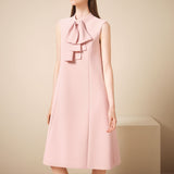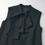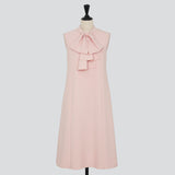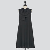 高めに設定された襟元に大ぶりのリボンをあしらった、女性らしさと品の良さが際立つノースリーブのAラインワンピースです。