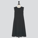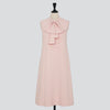リボンは取り外しが可能で、外すとシンプルなクルーネックに変化し、シーンやスタイリングに合わせて表情を自在に変えることができます。バックジップ仕様で着脱もスムーズに。程よく広がるフレアシルエットが身体のラインを拾わず、美しい立ち姿を叶えてくれます。生地はほんのりとした光沢感と控えめなマット感を併せ持ち、肌をやさしく引き立てながら上質な印象に仕上げます。リボンを添えて華やかなオケージョンに、外してシンプルな一枚で日常の特別なシーンに。一着で幅広いスタイルに対応できる、タイムレスな魅力を備えたドレスです。