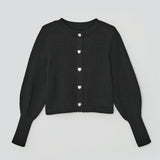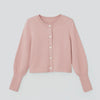 ハートシェイプのパール飾りボタンが装いにさりげないアクセントを添える、バレンタインシーズンにもふさわしい一着です。