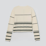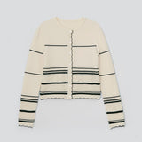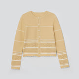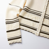 配色のストライプと繊細なレース編みが特徴のニットカーディガン。