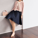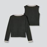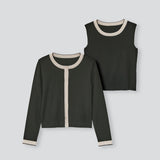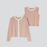 カーディガン&ノースリーブプルオーバーのニットアンサンブルです。糸は肌触りの良いイタリア産のカシミヤシルクで、カーディガンのボタンは同色釦になっています。アンティークベージュ×パールホワイト(配色)、ブラック×サンドベージュ(配色)の2色展開です。カーディガンの裾に入ったFB刺繍が特別感を。