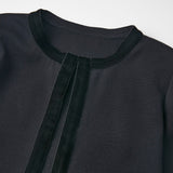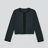 襟ぐり、前立て、袖口のベロアリボントリムがデザインポイントのニットジャケット。
