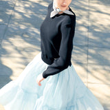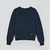 スウェットから着想を得た襟ぐりの三角リブ編みが、さりげないアクセントを添えます。
